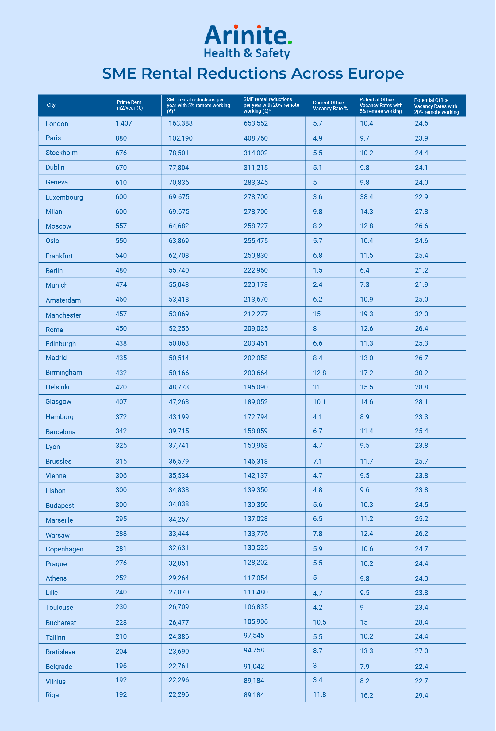 Office rental is the second highest cost behind wages for most companies, so Arinite have analysed the rental costs in different European cities to reveal the potential savings that SMEs will make with this move towards remote work.