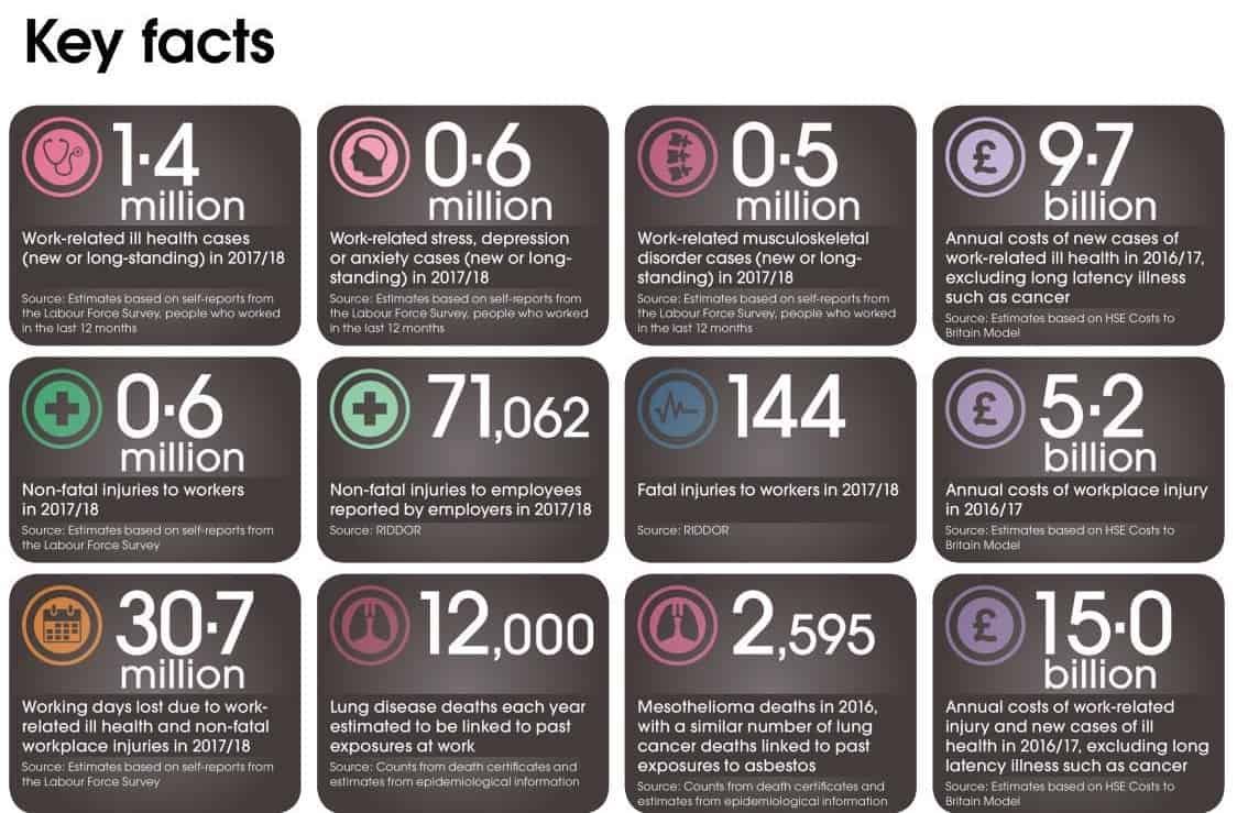 The 0.6million non-fatal injuries are dwarfed by work-related ill-health cases and stress (2.0million combined).